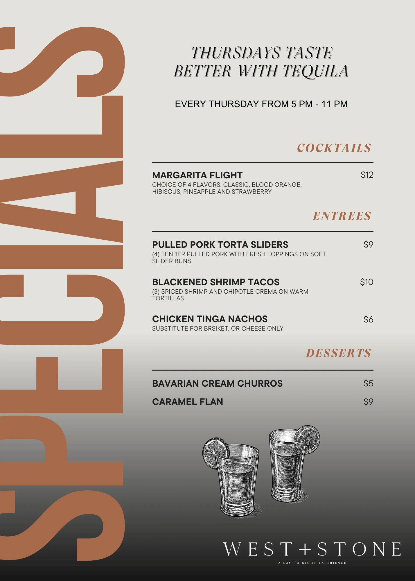Thursdays are just better with tequila. Join us every week from 5pm-11pm for margarita flights, special entrees, and desserts.